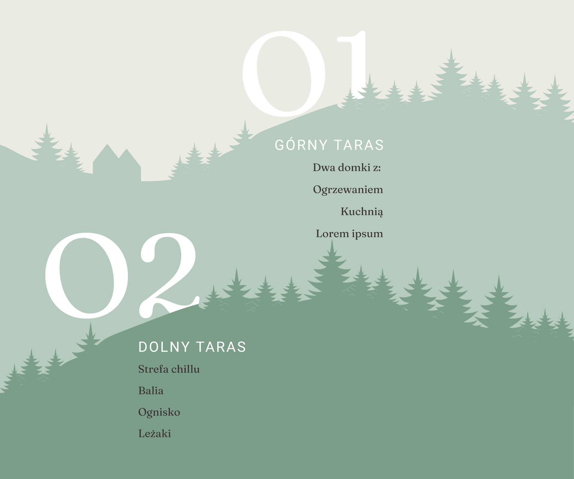 -> Górny teren to przestrzeń mieszalna – tu znajdują się domki wraz z parkingiem. Zwróć uwagę na niesamowity widok z okna. Gwarantujemy, że zapewni Ci energię na cały dzień!